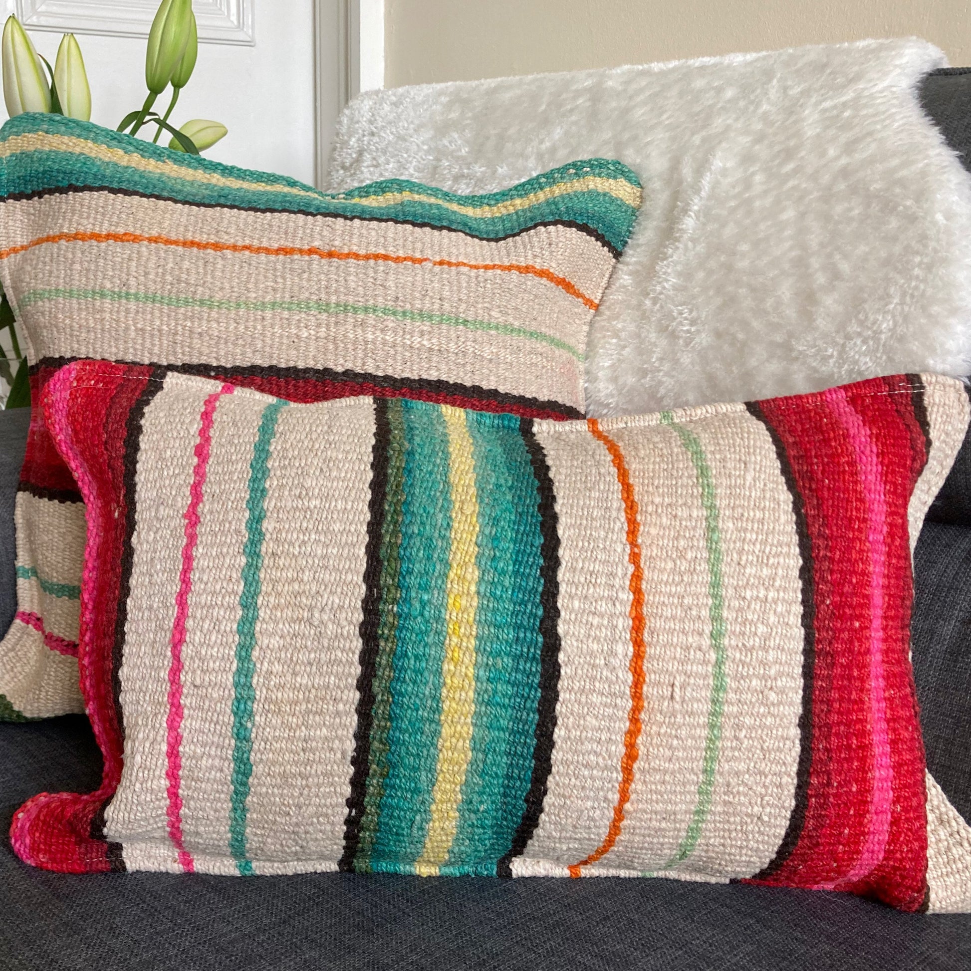 Our  'one-of-a-kind' handcrafted cushions are made in and around the villages of Cusco, Peru. Following pre-inca weaving techniques, the wool in this textile has previously been hand-spun on a drop spindle.