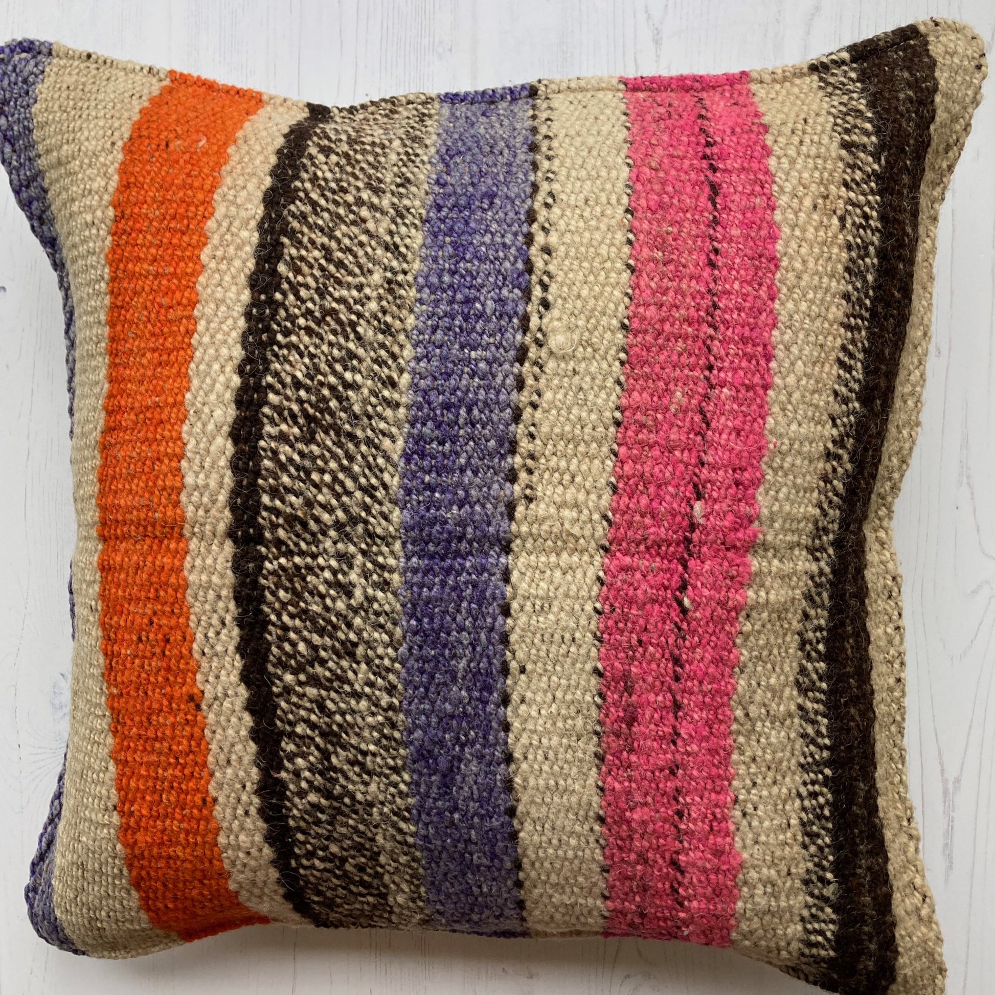 These 'one-of-a-kind' handcrafted cushions are made in and around the villages of Cusco, Peru. Following pre-inca weaving techniques, the wool in this textile has previously been hand-spun on a drop spindle.